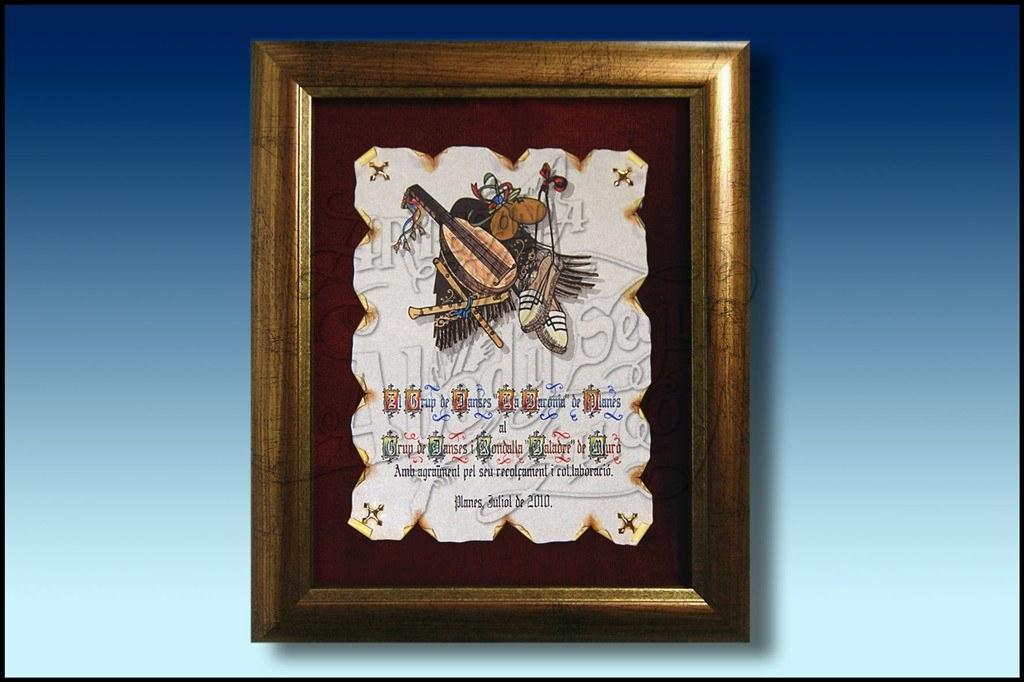 Pergamino con anagrama o escudo pintado a mano, con dedicatoria en la parte inferior.