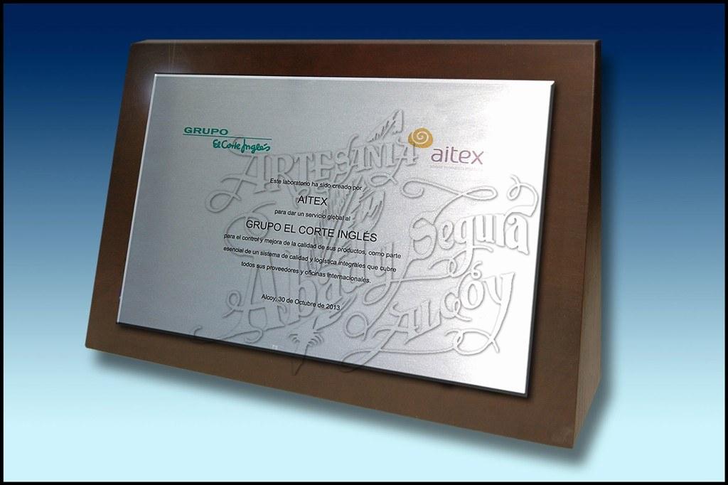 Placa plateada con estampacion de inscripción y logos a color.