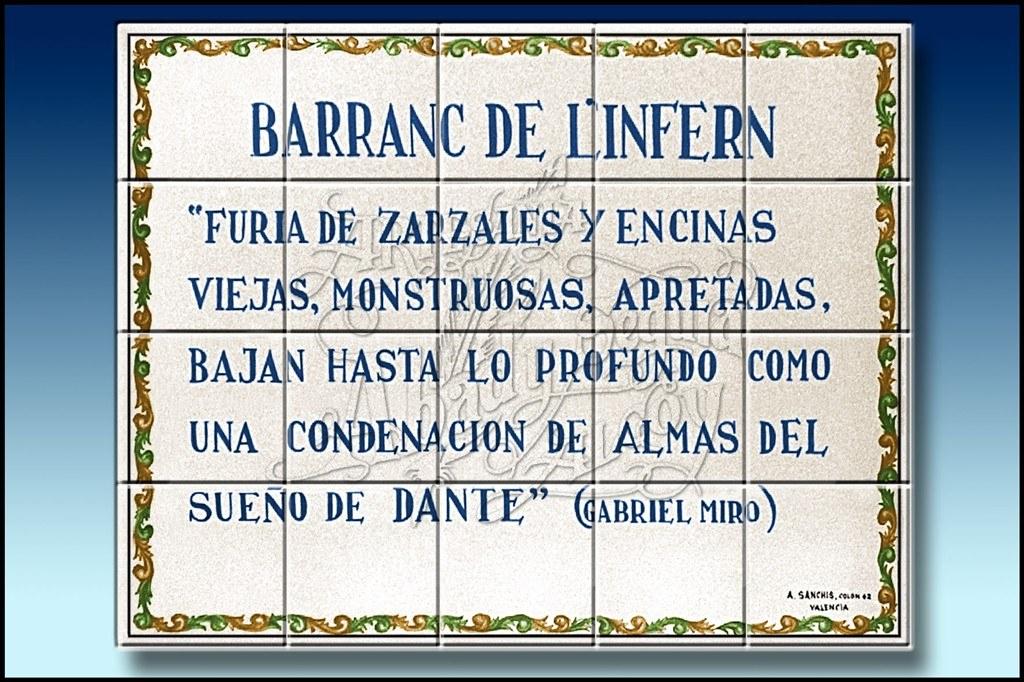 Manisas con texto escrito por Gabriel Miro, "Barranc del Infern". Situadas sobre la fachada de la Estacion Cientifica Font Roja Natura, inaugurada en el año 2005. Edificio que se encuentra en el Parque Natural del Carrascal, de la Fuente Roja, de Alcoy. (Parc natural del Carrascar de la Font Roja, en valenciano)