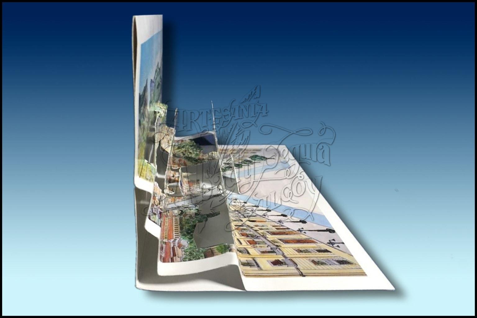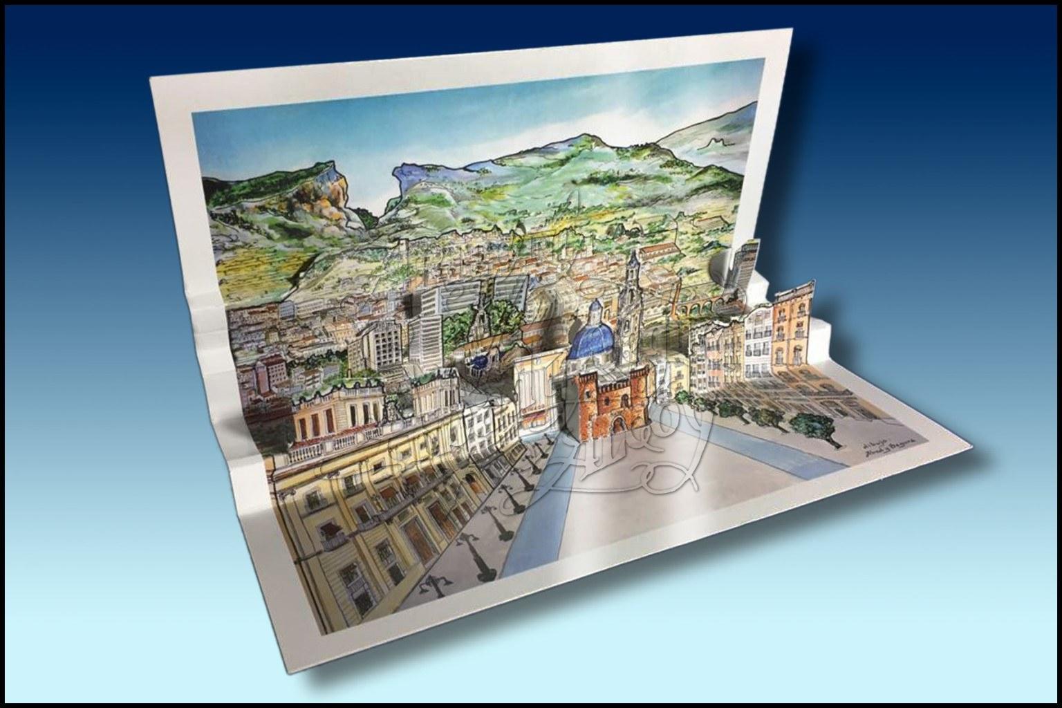 Postal en 3D, tipo desplegable de la vista de Alcoy. Dibujo realizado con acuarela a todo color.