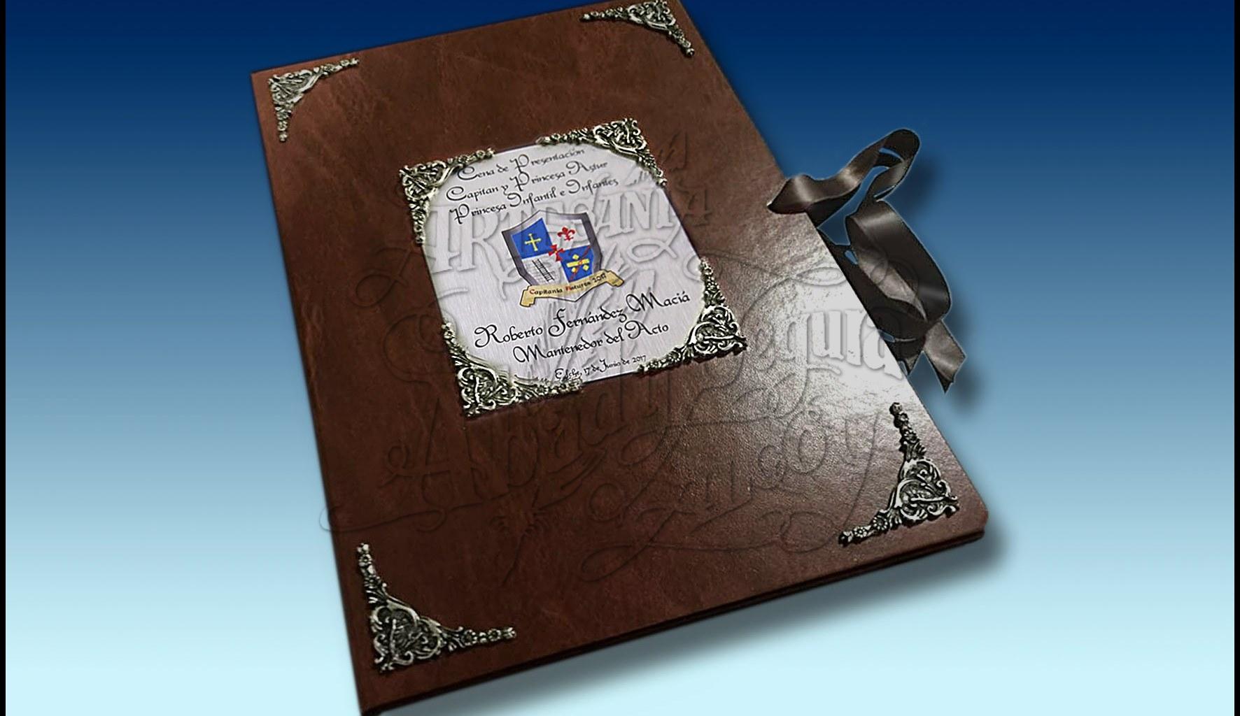 Carpeta con placa grabada en tapa, para eventos protocolarios como distinciones, pregonero, mantenedor...incluso para bodas y celebraciones.