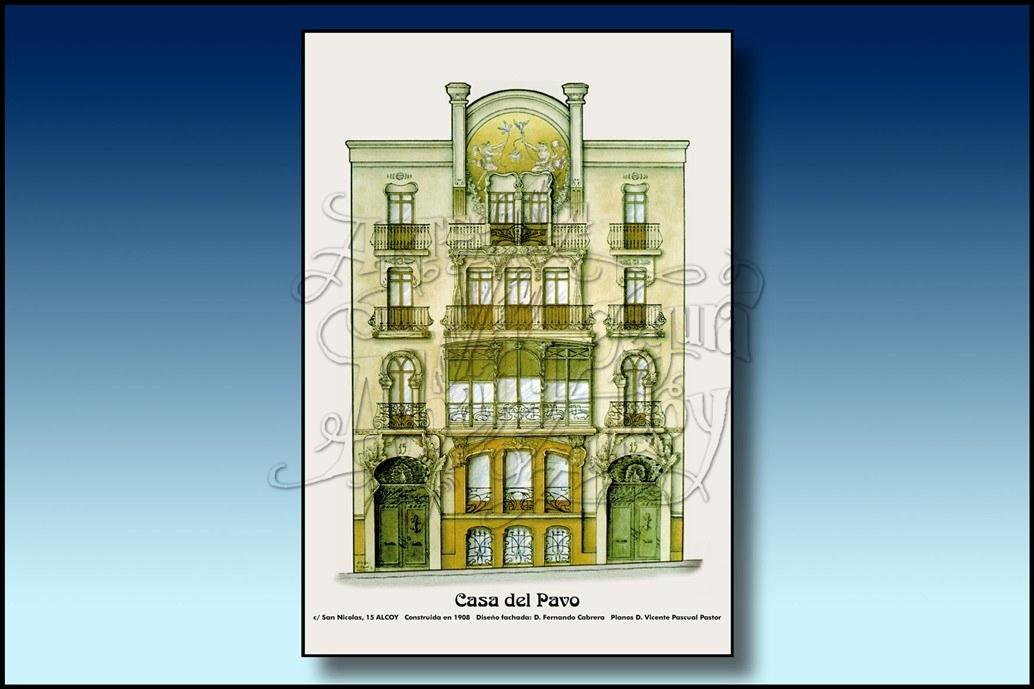 Dibujo de la fachada de la Casa del Pavo de Alcoy, de estilo modernista construida en 1908.