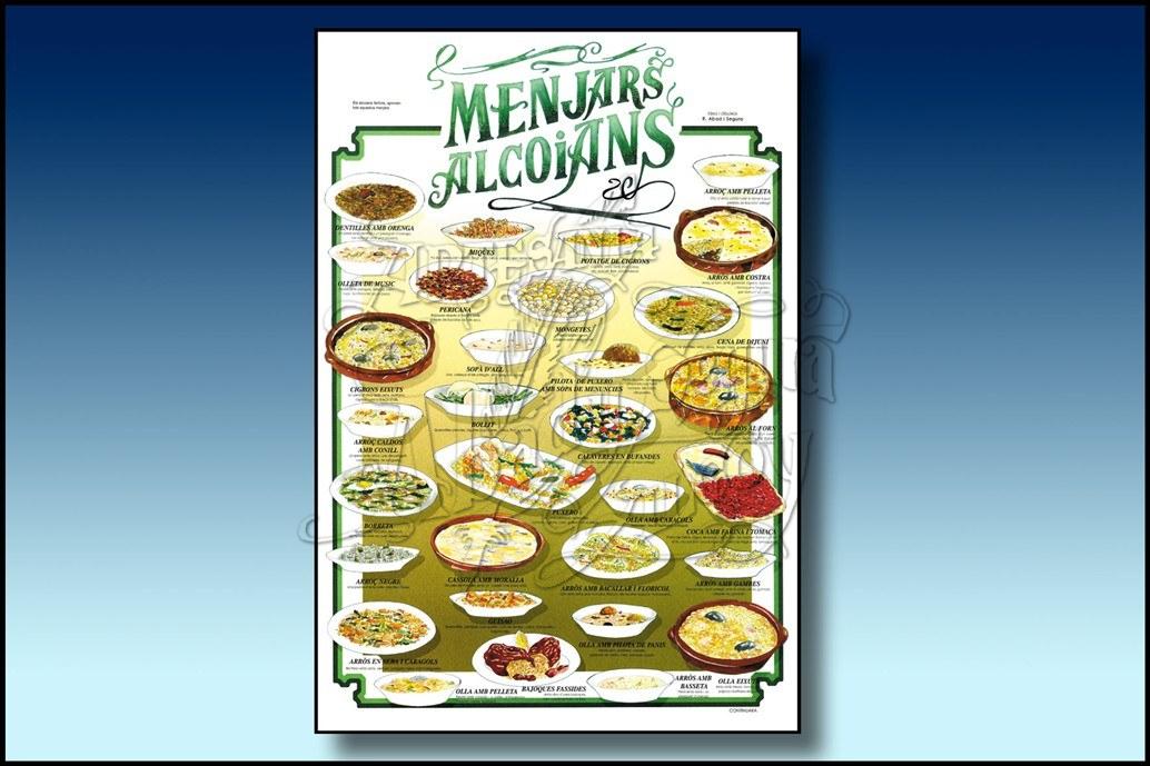 Lámina con dibujos de los platos típicos que se cocinan en Alcoy, denominados: Menjars alcoians.