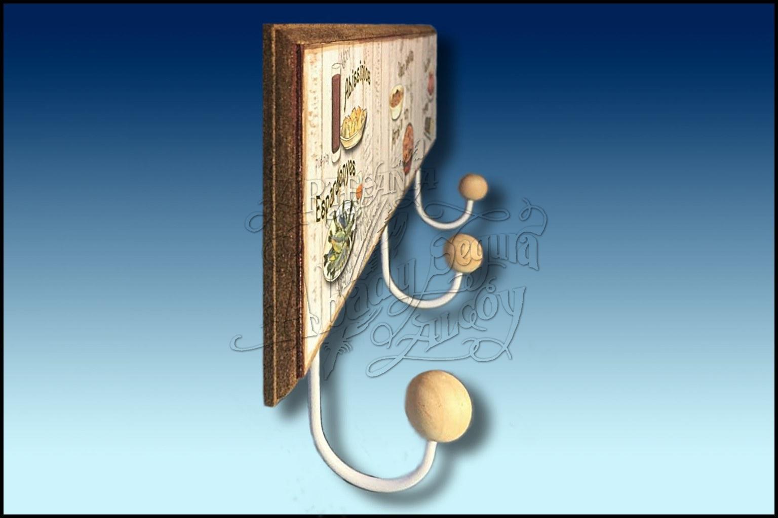 Perchero de madera con tres colgadores, decorada con motivos gastronómicos típicos de Alcoy, de estilo modernista.