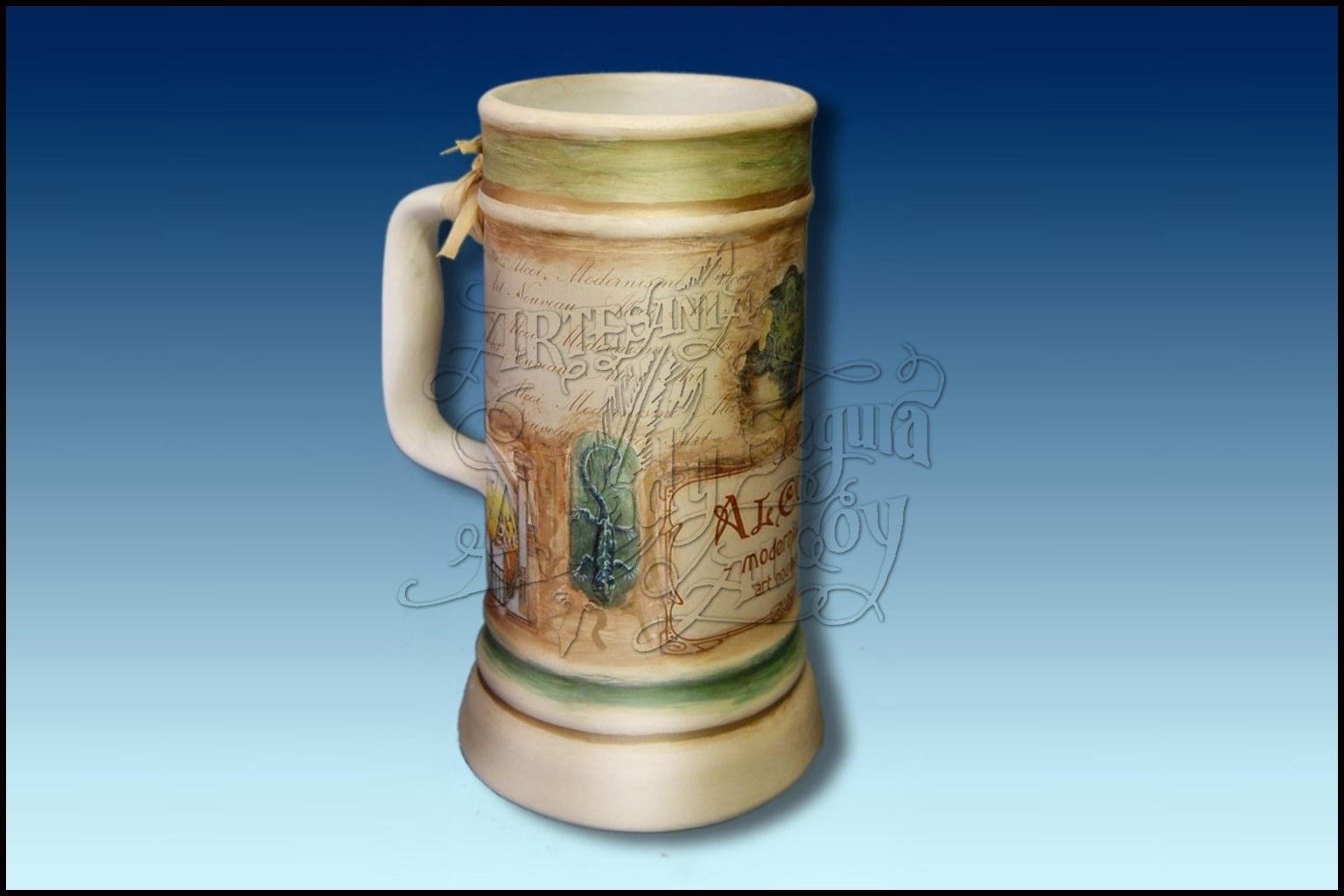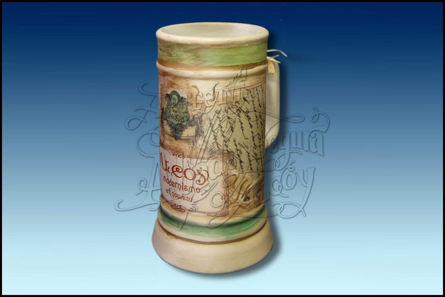 Jarra decorativa con dibujos de elementos decorativos modernistas de Alcoy. Homenaje a la arquitectura modernista que se desarrolló en Alcoy, entre los años 1900 y 1920. Estilo estético con un fuerte componente ornamental inspirado en la naturaleza, la flora y la fauna.
