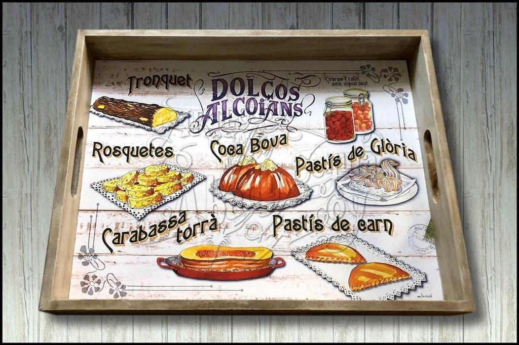 Bandeja de madera decorada de estilo modernista, con dibujos representativos de dulces típicos alcoyanos. Se puede personalizar con alguna inscripción. Enviar texto por whatsapp o e-mail.