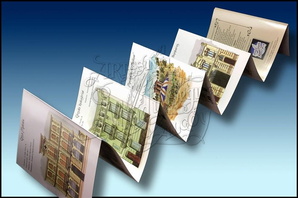 Además del dibujo de las fachadas de los edificios, hay una breve reseña sobre en que dirección es hallan, el año en el que construyeron, el arquitecto que lo hizo y el propietario.