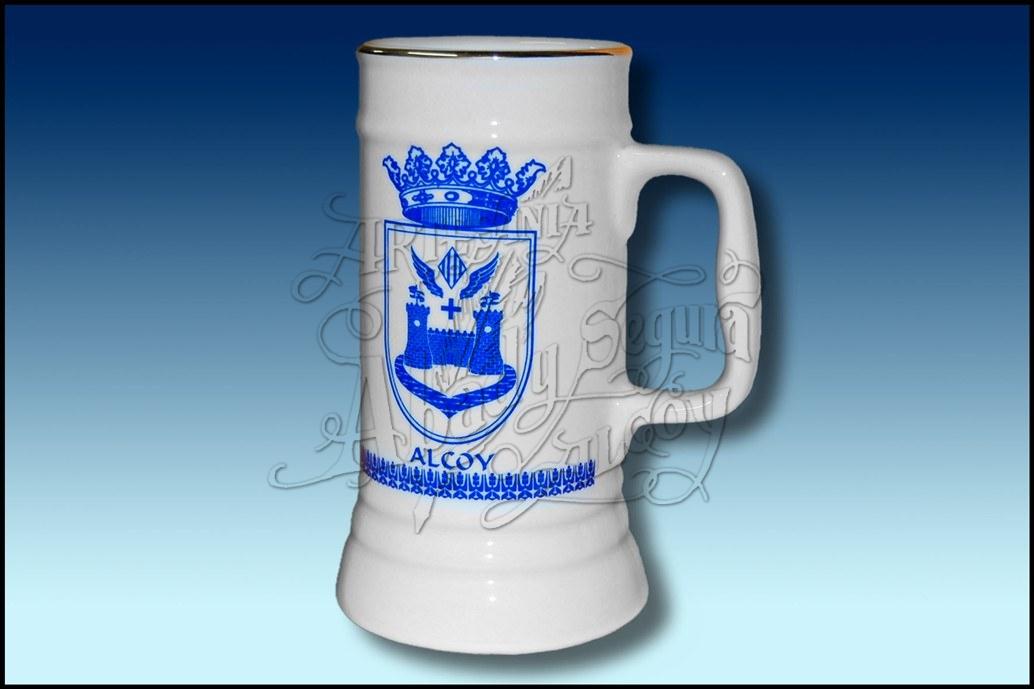Jarra de cerveza de porcelana blanca con escudo de Alcoy y cenefas en azul cobalto.