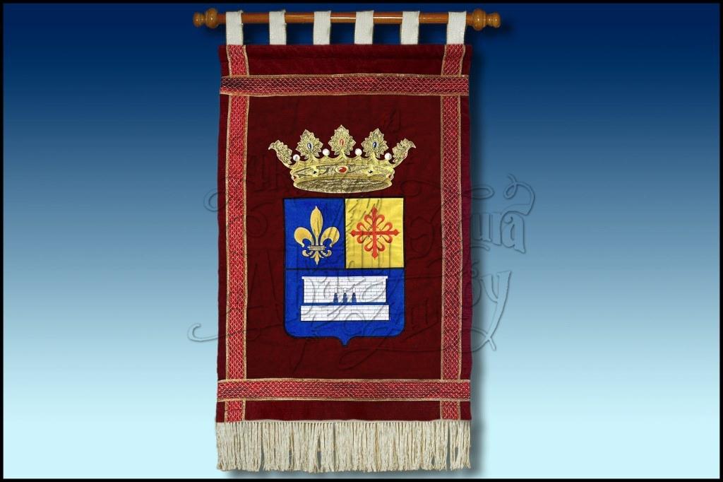 Tapiz con escudo de población bordado sobre terciopelo. Se puede realizar de cualquier escudo tanto de municipios como de comparsas o filás. También se puede elaborar de escudos de Entidades Oficiales, Ayuntamientos, etc. Fondo de terciopelo de varios colores a elegir.