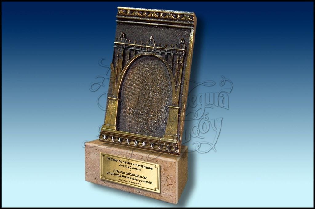 Trofeo del Puente de San Jorge de Alcoy, en bajorelive. Realizado en resina, en acabado bronce.