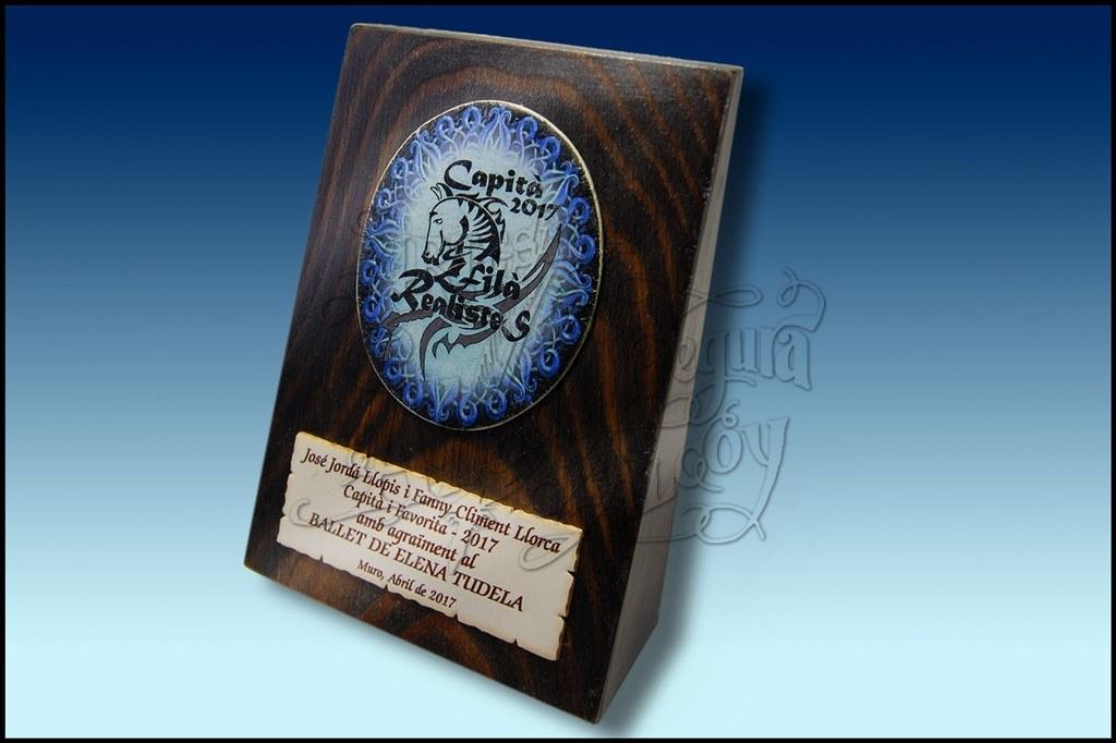 Escudo o logo de la entidad, realizado en material ceramico. Sobre una base de madera, a modo de pisapapeles.