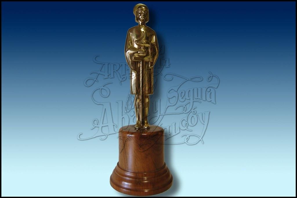 Galardon Oscar San Crispin de Elda, realizado en bronce de fundicion. Sobre una base de madera lacada, donde se le añade una placa con el texto de los premiados.