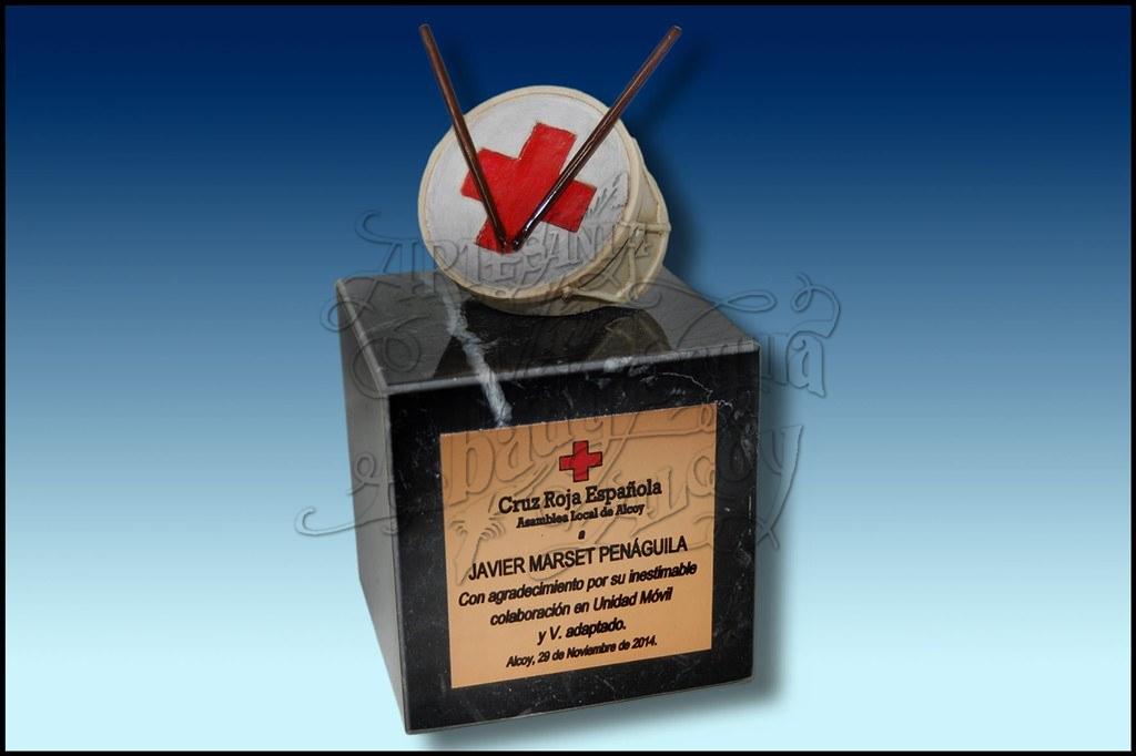 Galardon al voluntariado de la Cruz Roja, Asamblea Local de Alcoy. Tambor realizado en resina y pintado a mano, con unas baquetas de zamac sobre el parche. Todo ello, sobre una base de marmol, donde se le añade una placa con el texto de los homenajeados.